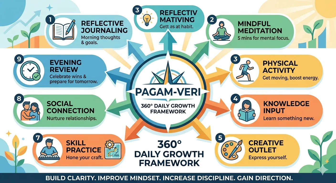 PAGAM-VERI is a simple 360° daily growth framework designed to improve clarity, mindset, discipline, and long-term direction.